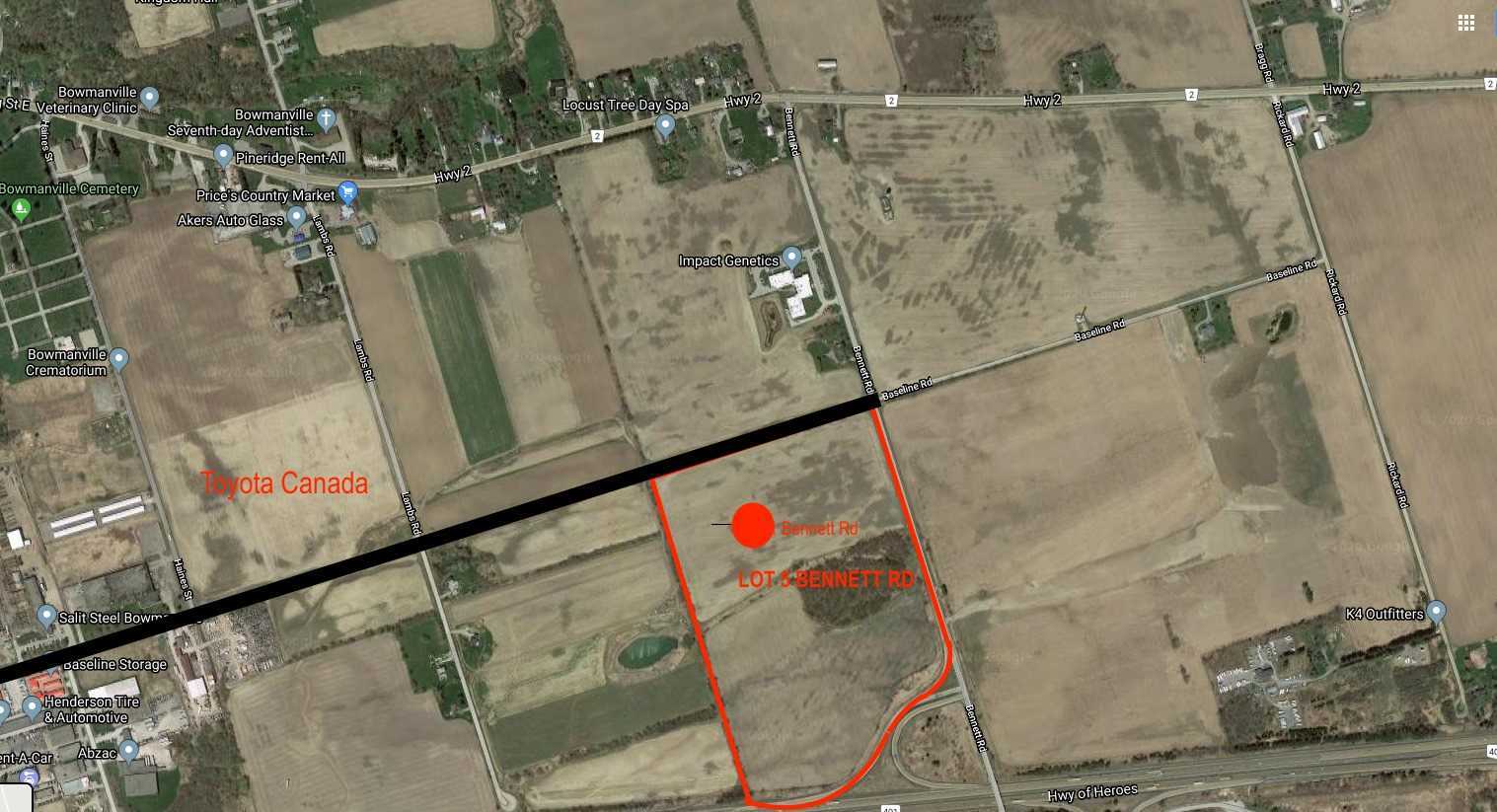 53.18 Acres Located In The Clarington Technology Park/Designated For Industrial & Commercial Uses, Which Permits An Extensive List Such As Prestige Employment 1 & 2,Hotel & Convention Centre With Frontages On Baseline Rd, Bennett Rd And The 401/East & West 401 Interchanges/Great Opportunity For Development/ Services Are Budgeted By The Region Of Durham On Newly Constructed Baseline Rd, Services Currently Available And Located At Lambs& Baseline Roads.